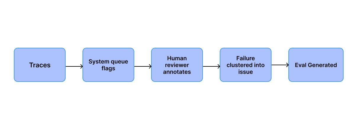 The annotation queue converts volume into signal. Thousands of traces your generic evals flag become a few dozen annotated examples of a specific failure. Without this bridge, you're writing evals in the dark and wasting time.